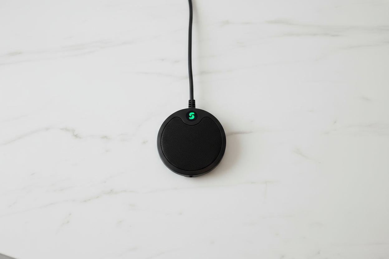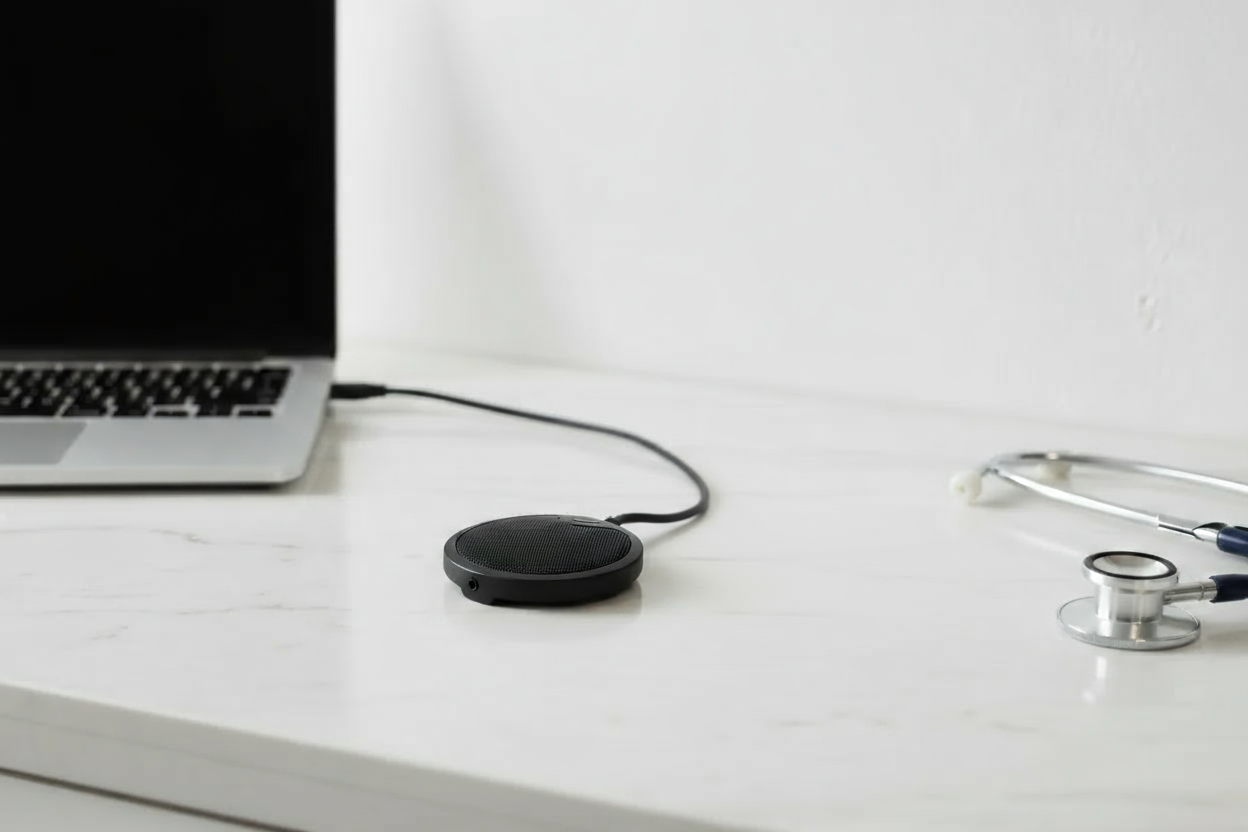Le microphone Squire se connecte facilement via USB, vous permettant de convertir automatiquement vos conversations ou dictées en documentation médicale. Il suffit de le brancher sur votre port USB pour qu'il soit instantanément détecté par le logiciel Squire, sans installation requise. Ce microphone haute performance est conçu pour capturer intelligemment des conversations d'une clarté exceptionnelle. La portée de captation sonore peut atteindre 3 mètres, voire plus, selon l'acoustique de la pièce. Une touche tactile vous permet d'activer et de désactiver facilement le son, vous offrant ainsi un contrôle total sur ce qui est capturé et documenté. Le microphone Squire est doté d'un boîtier entièrement métallique, discret et aux lignes courbes, ce qui en fait un atout esthétique et fonctionnel pour toute salle de consultation.